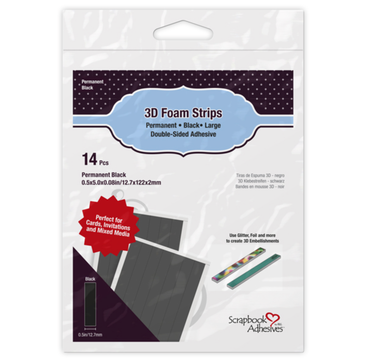 3D Foam Strips Large contains 14 pieces of pre-cut, permanent, double-sided adhesive strips of foam. Use them to create dimensions on cards, scrapbook pages and mixed media crafts.