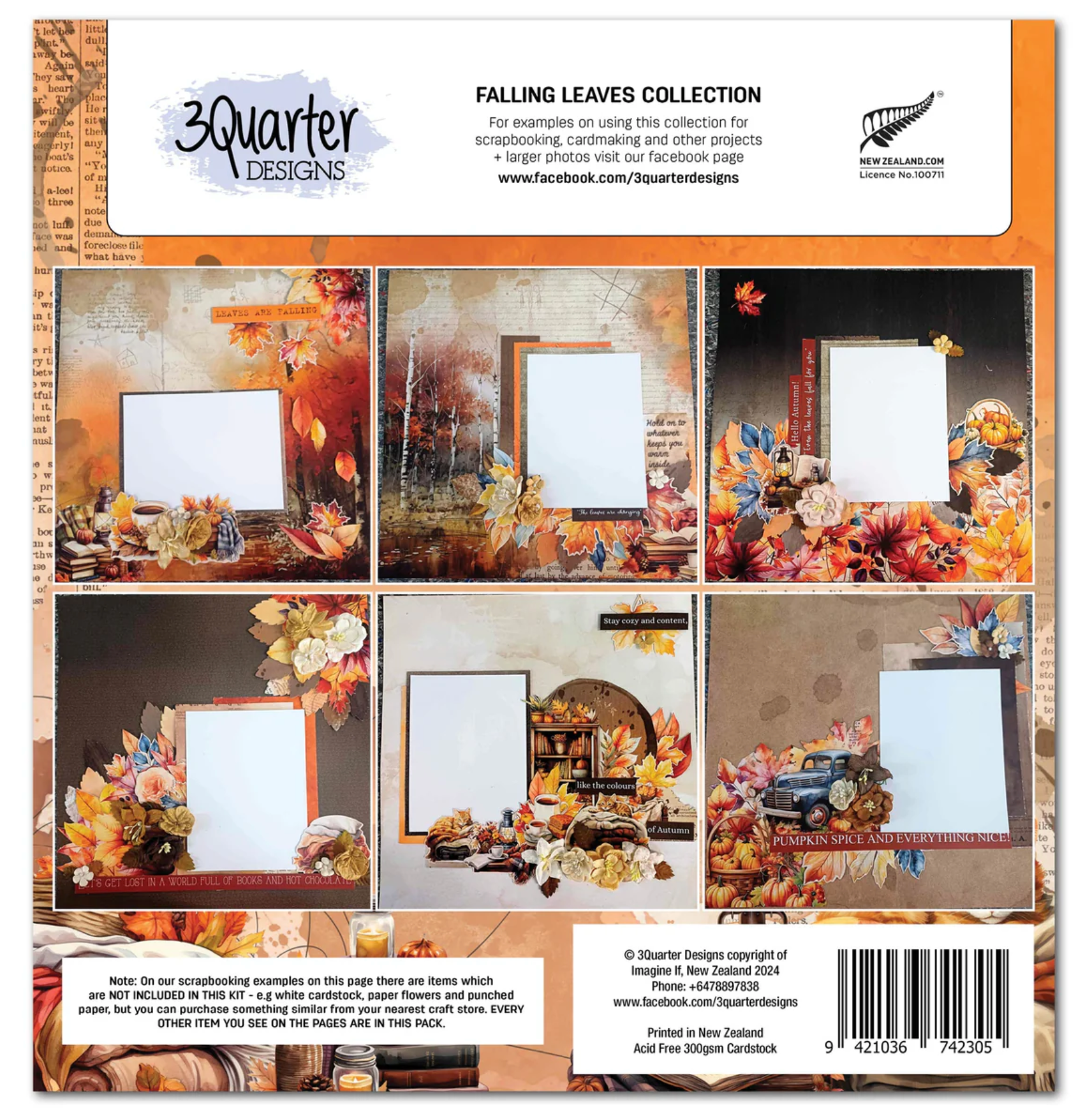 Discover the beauty of Autumn with 3Quarter Designs' Falling Leaves collection. This collection has a warm color palette of orange, yellow and red along with charming designs featuring Autumn coloured leaves, pumpkins, gourds, vintage trucks, cups of tea, warm blankets and lazy cats. Create cozy memories with this seasonal collection. The Falling Leaves collection includes a 12" x 12" Scrapbook Collection, an 8" x 8" Paper Pack, a 6" x 6" Paper Pack and a 4" x 6" Card Pack. All sold separately. Designed and printed in New Zealand.