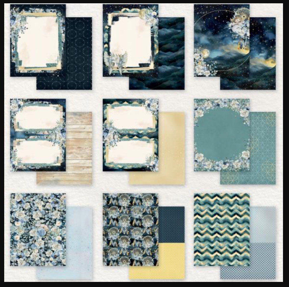 Starlight Dreams paper invites you to gaze upon a canvas of navy, sprinkled with celestial shades of blue and shimmering gold. This collection evokes the magic of a starry night, adorned with a constellation of beautiful motifs. Pack includes three each of 9 double-sided sheets of heavy weight cardstock.
