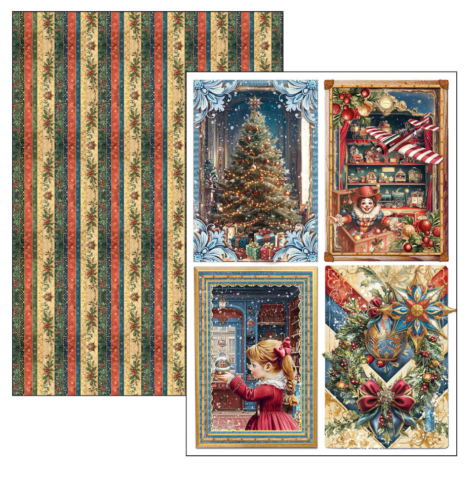 Step into a charming world where time stands still, and the magic of childhood comes alive through the warmth of vintage toys and nostalgic shop windows. “Toy Shop” brings to life the cozy, whimsical atmosphere of an old-fashioned toy store, filled with treasures that echo the joy and innocence of years gone by. The collection’s rich colors – deep bordeaux, serene blue, and soft ivory – create a timeless palette that mirrors the elegance of antique toys and the quaint charm of the shops they come from. Each piece is a tribute to the simple pleasures of childhood, evoking memories of the past while inspiring new ones. Let yourself be transported to a world where every toy tells a story, and every corner of the shop sparkles with festive cheer.