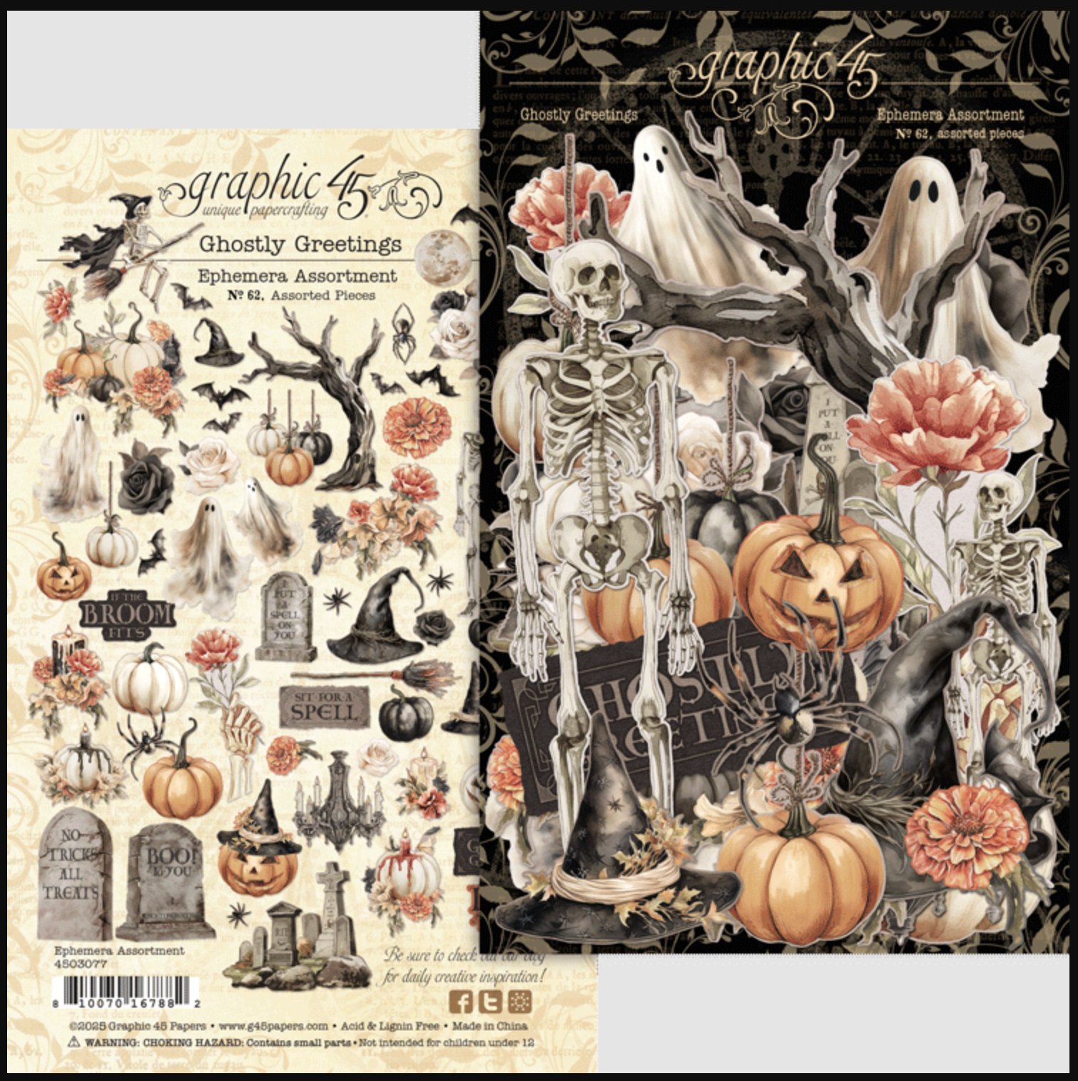 Enter a world of vintage Halloween charm with Graphic 45’s Ghostly Greetings Paper Collection. This spirited collection conjures up a dreamy Halloween garden filled with spooky ghosts, delicate spiderwebs, curious black bats, and graceful fall florals. Ivory and midnight pumpkins, weathered tombstones, and skeletal touches dance across a palette of dusty orange, soft cream, charcoal black, and antique blush.