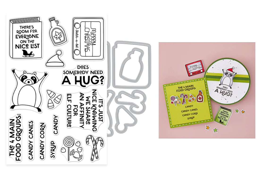 The Elf Culture Stamp & Cut set includes 15 clear stamps and 8 coordinating dies inspired by iconic elf-themed fun. Featuring playful elements like a bottle of maple syrup, candy, a raccoon, and quotes such as “Does somebody need a hug?” and “The 4 main food groups,” this set brings holiday cheer to cards, tags, and crafts. Perfect for fans of elf culture, it’s sure to delight crafters of all ages!