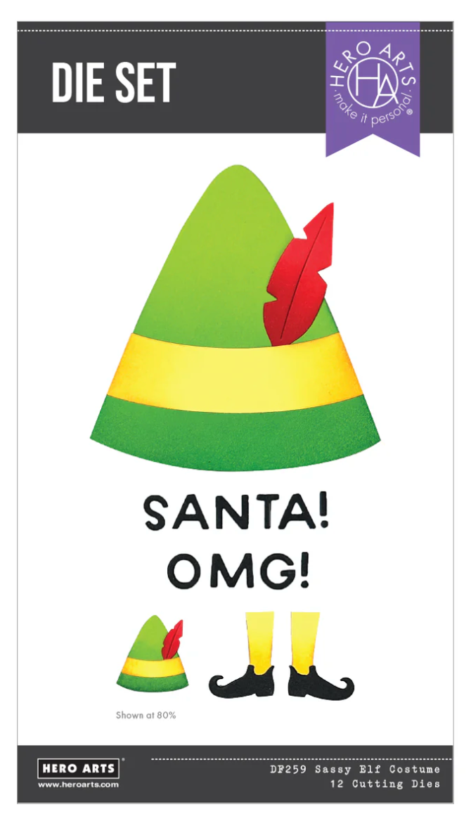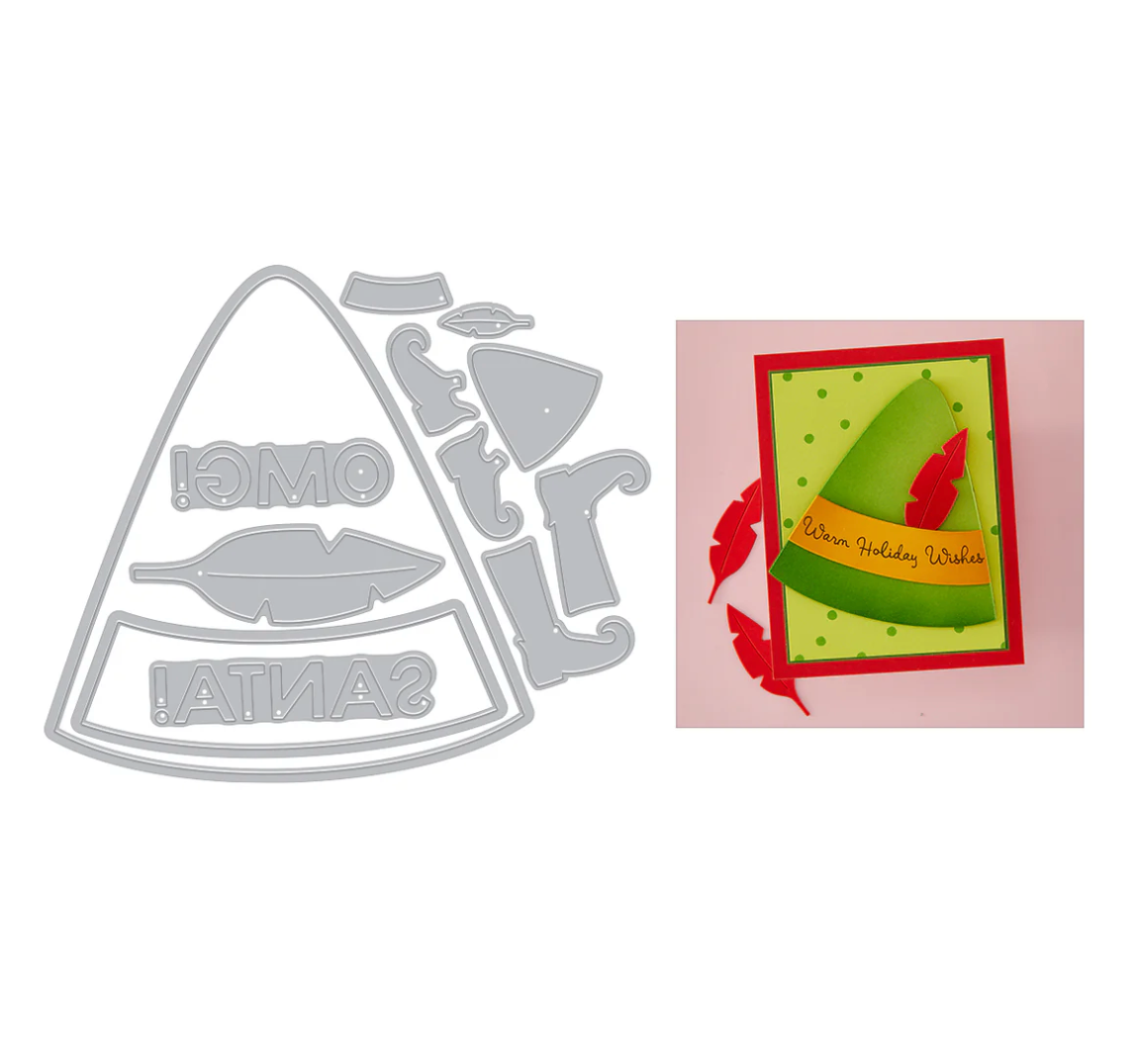 The Sassy Elf Costume die set includes 12 metal dies that create a whimsical elf hat, legs, and festive phrases like “SANTA!” and “OMG!” — perfect for holiday cards and crafts with playful personality.