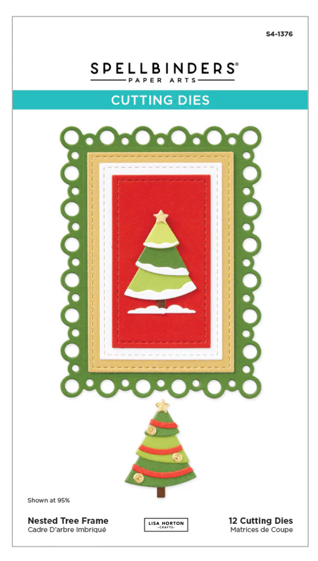 Nested Tree Frame Etched Dies is part of the Essential Holiday Collection by Lisa Horton. This set of 12 dies creates a wonderful nesting set of frames with a sweet layered pine tree in it's center. The largest frame is outlined with a fun scalloped pattern of hollow circles. The other frames in the set are bordered with an embossed stitch effect for extra interest. The star of the show is the lovely many layered tree for the center, filled with lots of options for decorating the tree... the versatility Lisa's products are known for!