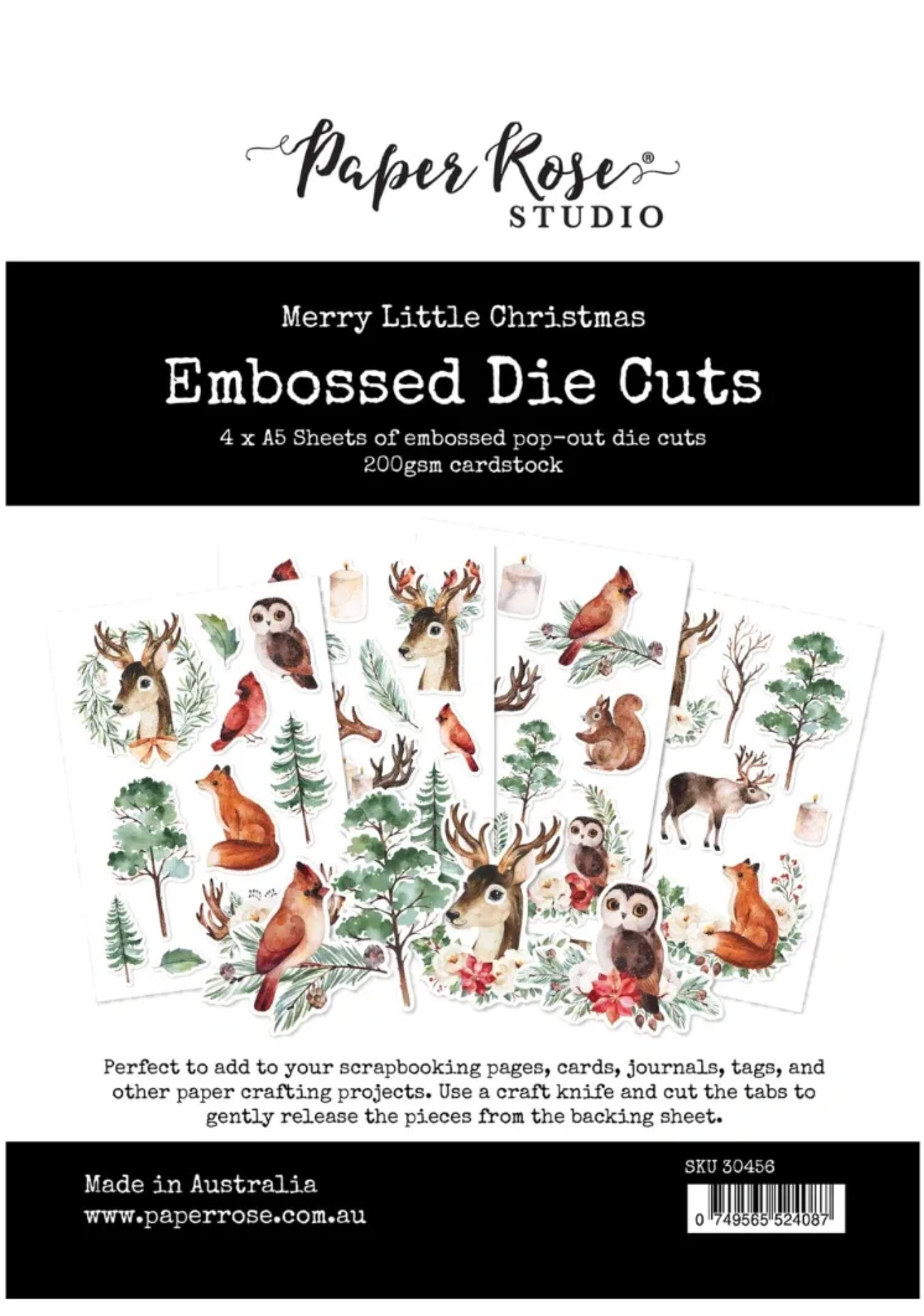 A festive array of printed forest animal and tree images with selectively embossed areas which add beautiful gloss and dimension. Perfect to add to your Christmas scrapbooking pages, cards, journals, tags, planners and other paper crafting projects. Use a craft knife and cut the tabs to gently release the pieces from the backing sheet. 200gsm cardstock. Made in Australia.