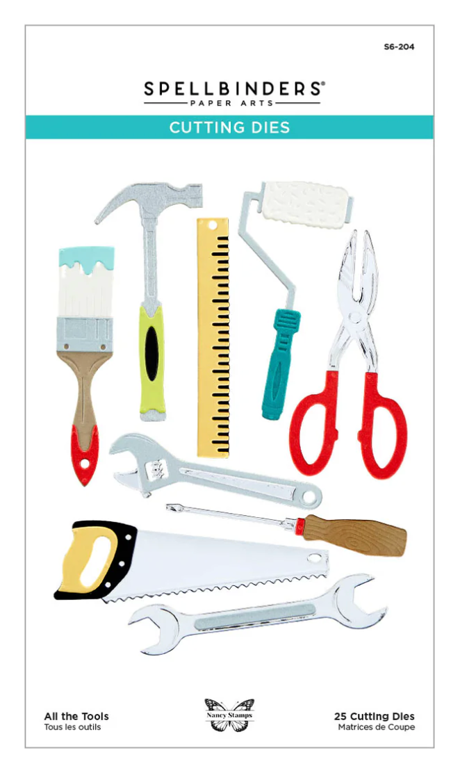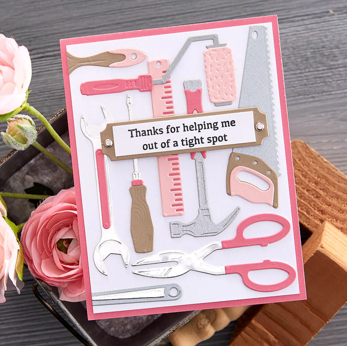 All the Tools Etched Dies are from the Toolbox Essentials Collection by Nancy McCabe. It includes a set of 25 thin metal cutting dies. It has all the tools from a hammer to a saw and even a ruler! Enough to get the job done right, and fast! Use metallic paper on the metal parts to make the tools look realistic.