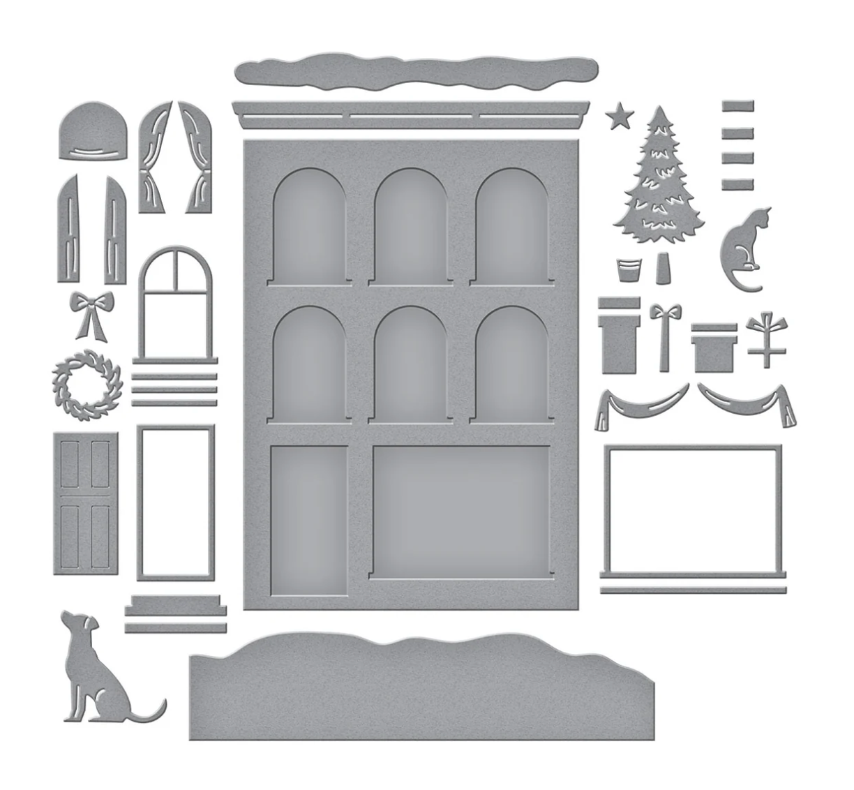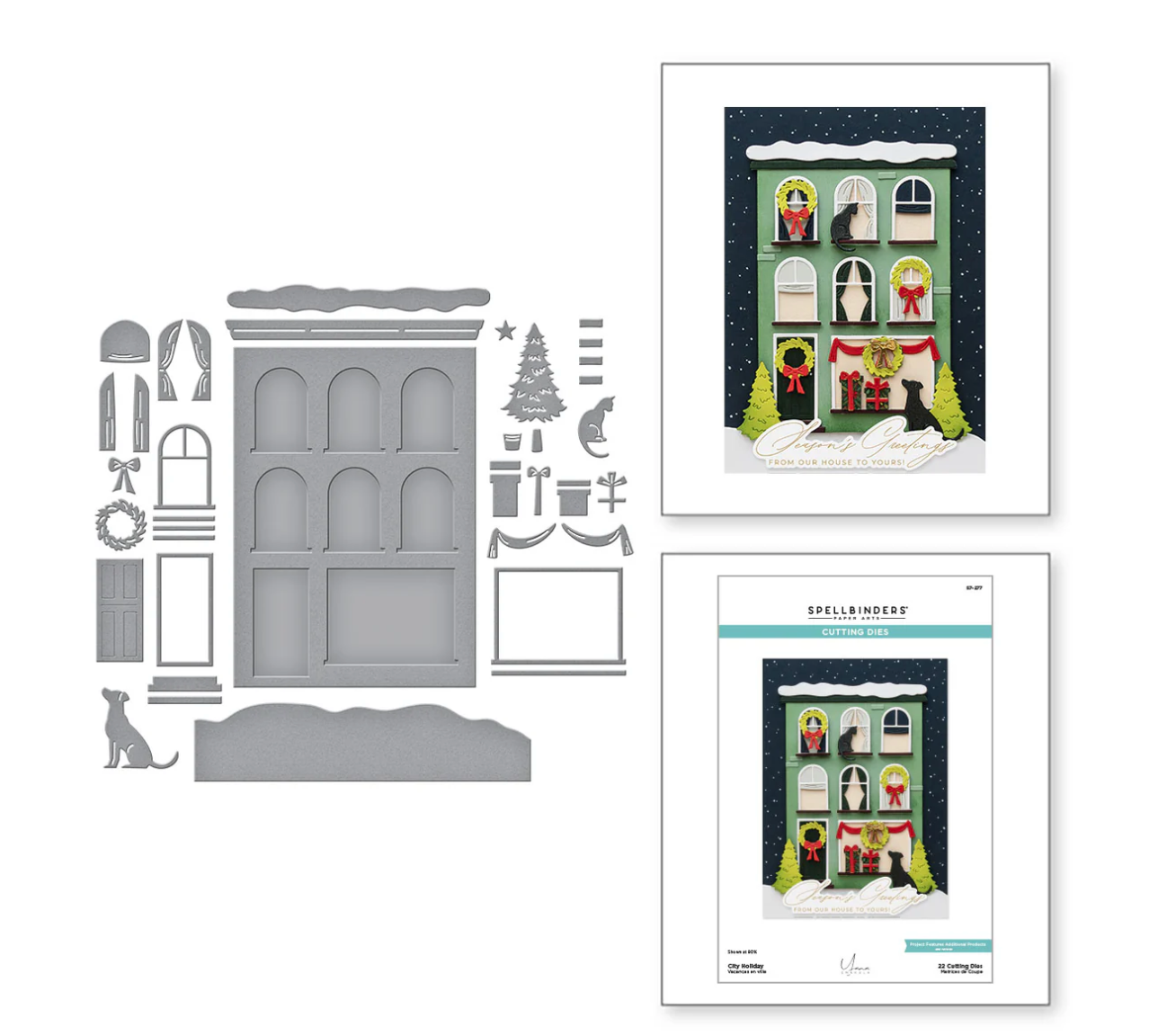 City Holiday Etched Dies are from the City Holiday Collection by Yana Smakula. When assembled, this set of 22 thin metal cutting dies makes a wonderful three-story building with a paneled front door, a show window and arched-shaped windows. Other details create the holiday mood with a snow-covered roof, wreaths, a Christmas tree, gifts and more!