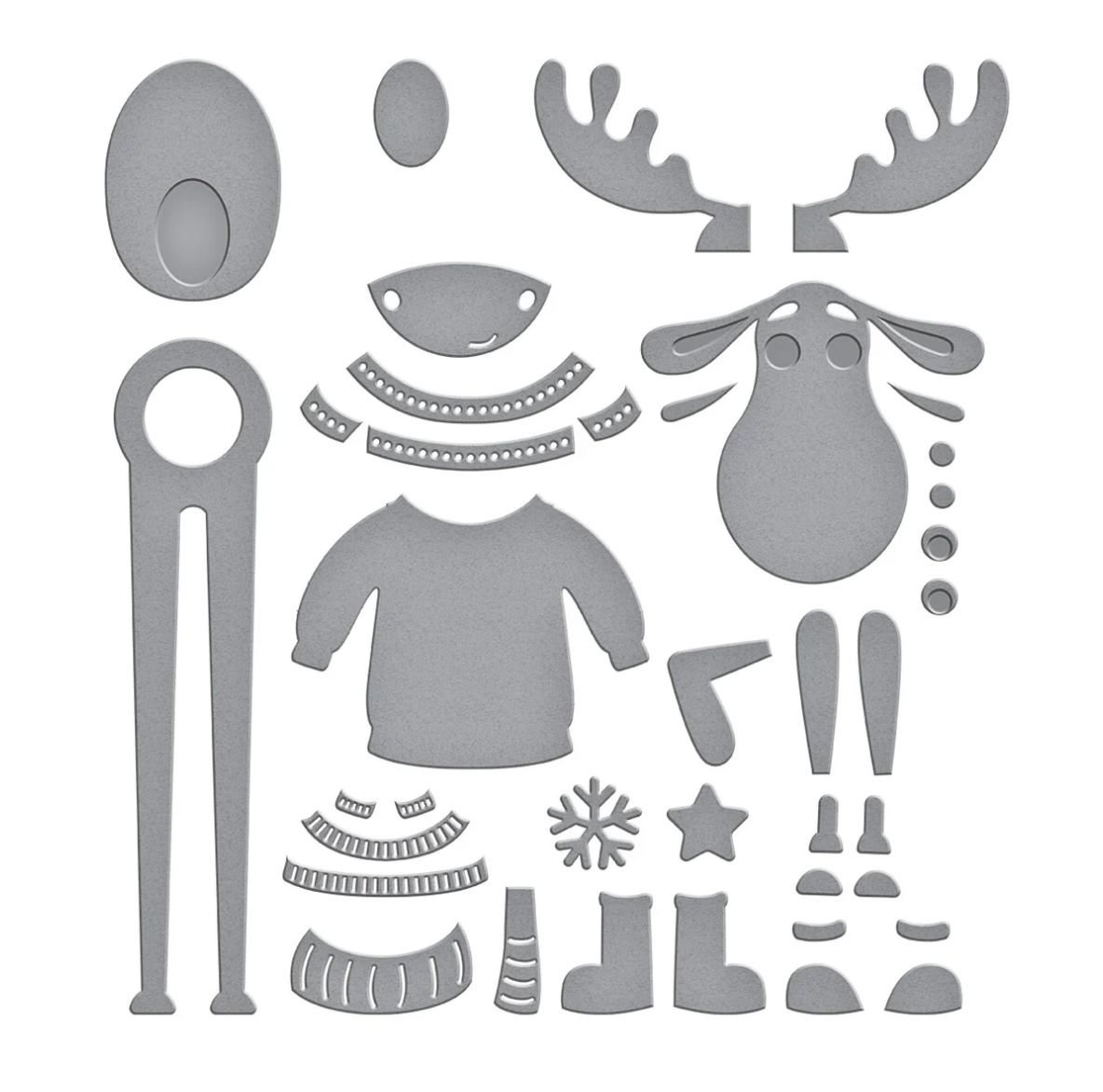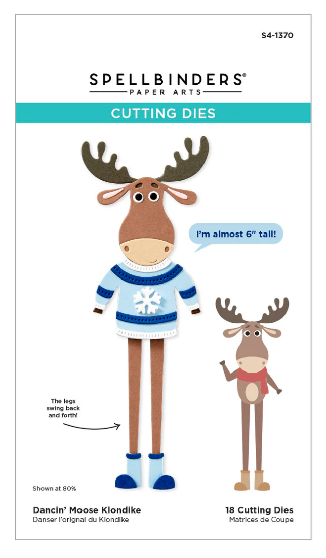 Dancin’ Moose Klondike Etched Dies is from the Dancin' Christmas Friends Collection with a set of 18 thin metal cutting dies. When assembled, it creates this fun moose with moving legs that swing back and forth. He is one tall moose measuring almost 6 inches tall! There are other fun accessories in the set to complete his outfit.