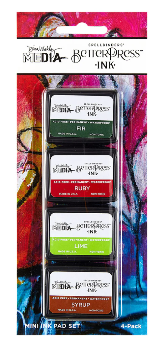 Festive BetterPress Ink Mini Set by Dina Wakley includes four 1.25 x 1.75-inch ink pads in colors of Fir, Ruby, Lime, and Syrup. Designed to coordinate with the acrylic paints and glosses in Dina Wakley's line of art supplies from Ranger Ink, these signature colors are perfect for capturing the bright and colorful tone Dina is famous for. These inks are specially formulated Ranger Archival Ink made for the BetterPress Letterpress System. They are acid free, permanent, and waterproof.