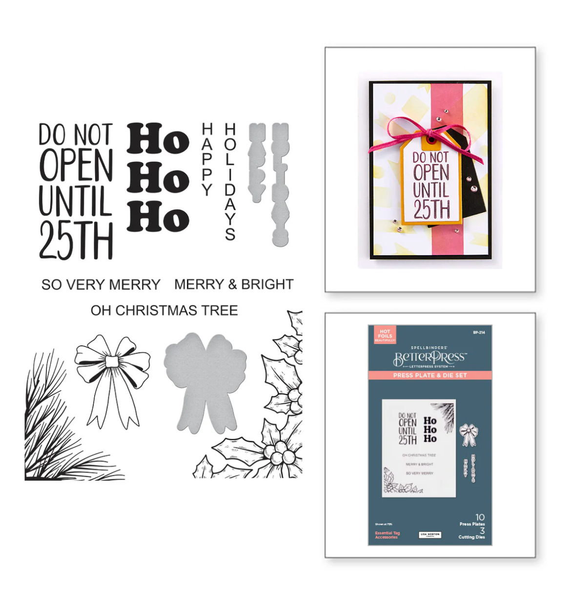 Essential Tag Accessories Press Plate & Die Set is part of the Essential Holiday Collection by Lisa Horton. With ten press plates of holiday sentiments and icons, this is the perfect set to add the finishing touch to your holiday projects. The sentiments include 'Do Not Open Until 25th' and 'Ho Ho Ho', sized to fit the tags in Essential Tags. Also included is a playful vertical 'Happy Holidays' with accompanying dies and three other sentiments to complete the holiday messages. With two corner icons of evergreen boughs and holly, as well as a sweet bow and coordinating die, this is one set you'll use again and again! Ink the plates with the BetterPress Ink to be pressed against the BetterPress Cotton Card Panel and Sheets for a crisp letterpress design.