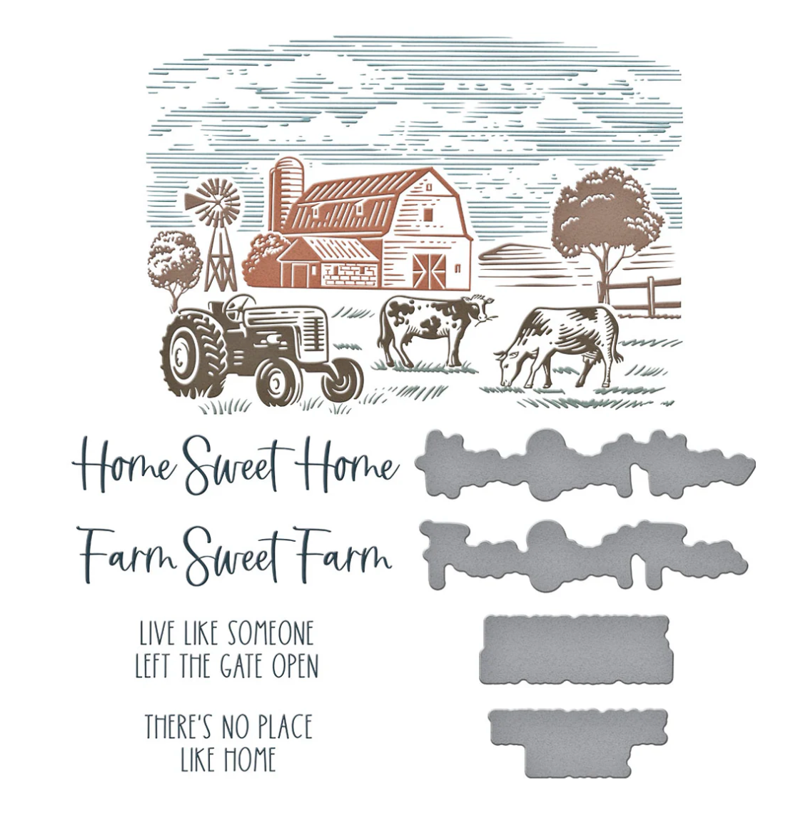 Farm Sweet Farm Registration BetterPress Plate & Die Set is part of the Justine's Farm Collection by Justine Dvorak. Create a peaceful farmhouse scene with this set of fourteen press plates, a clear acetate registration template for perfect placement and four thin metal cutting dies to cute out the sentiment. Let the registration mylar sheet guide you in making this scene come to life in color. Finish off with a choice of four sentiments that can be cut with the matching dies: Home Sweet Home, Farm Sweet Farm, Live Like Someone Left the Gate Open, and There’s no Place like Home.