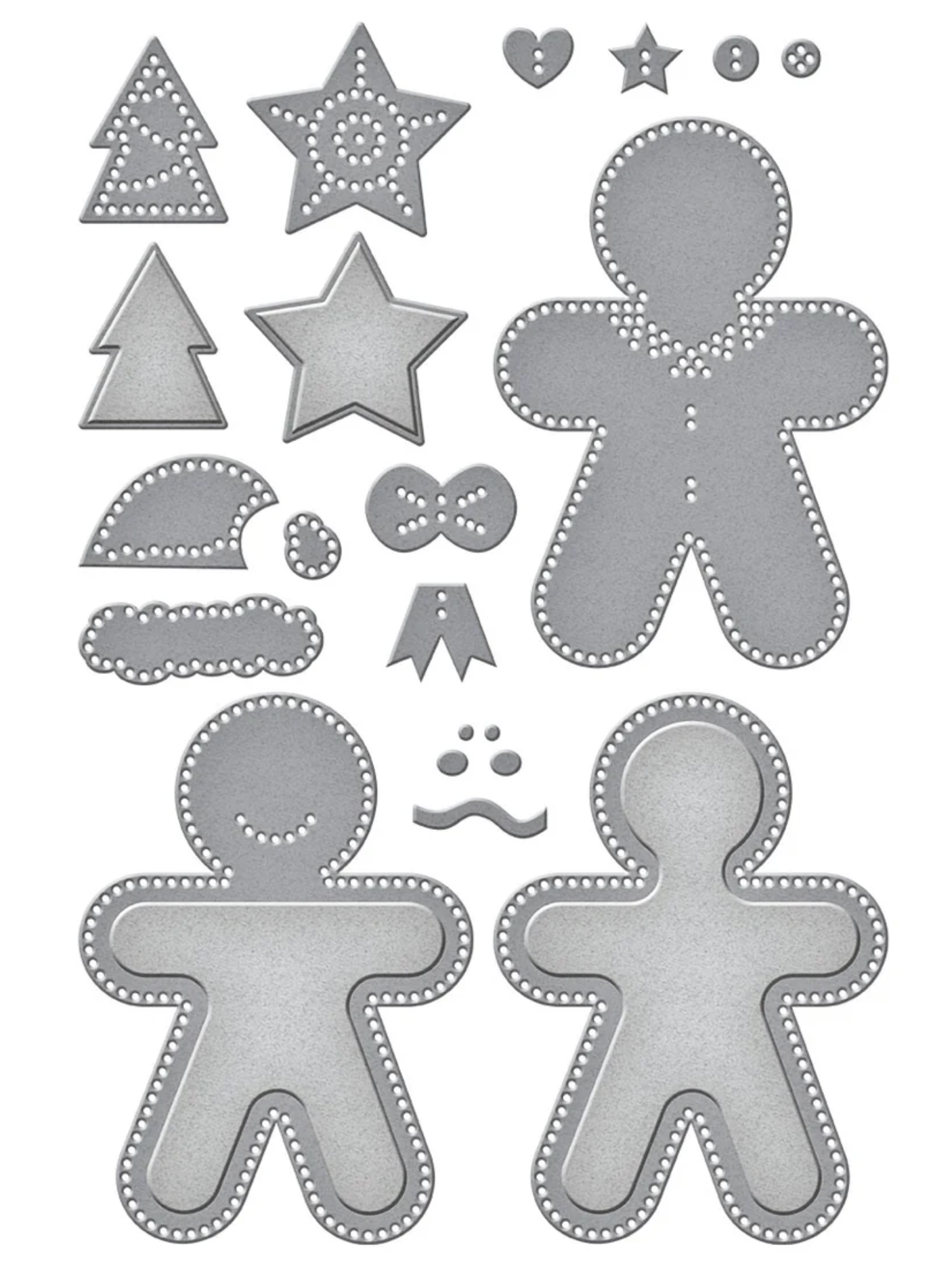 Felt Gingerbread Boy & Girl Etched Dies are from the Felt Stitch & Create Collection by Nichol Spohr. When assembled, this set of 19 thin metal cutting dies creates a gingerbread person with all kinds of wonderful details. It includes accessories to give it more character like as a Santa Hat, holiday tree, a layered bow tie and a detailed star. The detailed stitching design on the shapes edges gives a wonderful, finished look and creates a guide for stitching this gingerbread person together. Cut with our Merino Wool Felt Sheets sets to bring it to life in texture and dimension, or cut in paper for an entirely different look.