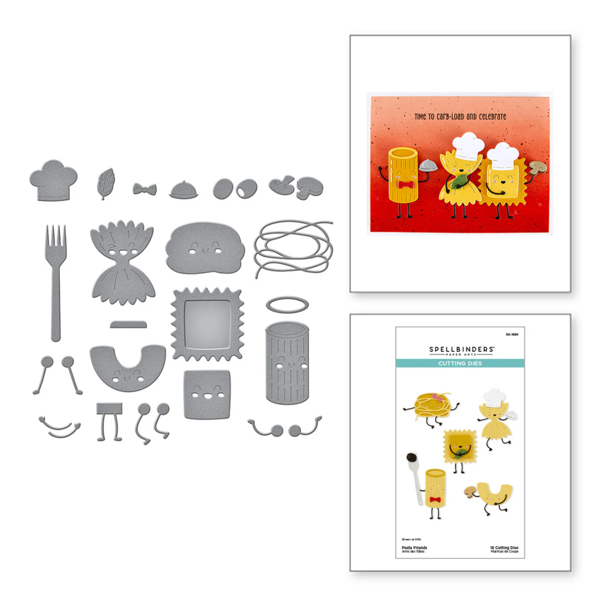 Pasta Friends Etched Dies are from the Buon Appetito Collection. Create fun pasta shaped characters with this set of 18 thin metal cutting dies! There are five pasta shapes (Rigatoni, Farfalle, Macaroni, Ravioli and Spaghetti) with accessories like arms, legs, hats, bowties, veggies and more! Make a cute couple or make a whole crew.