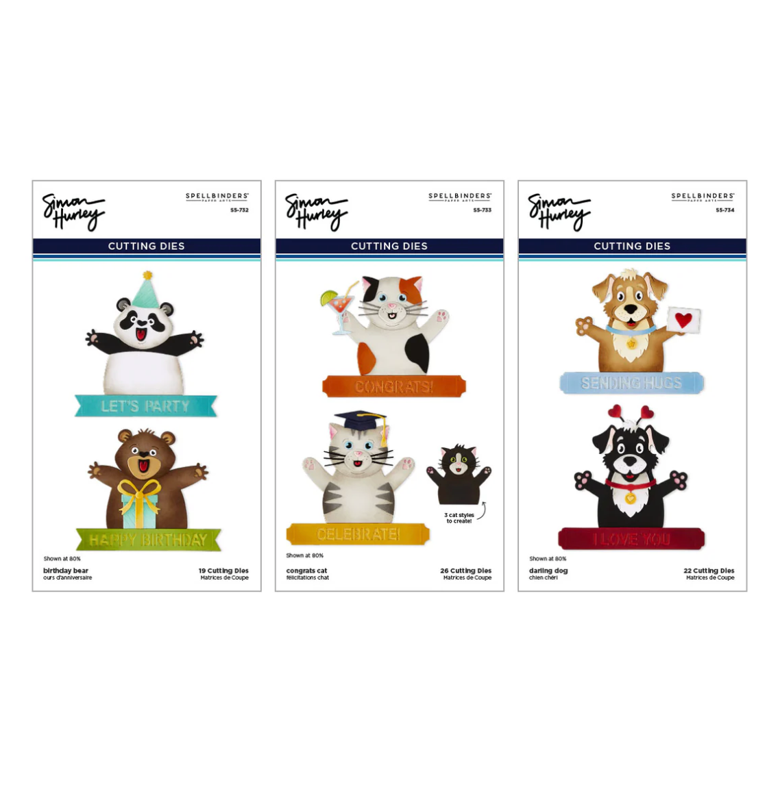 Sending Hugs Die Bundle is the perfect offering if you need a whole lot of hugs! The bundle includes S5-732 Birthday Bear, S5-733 Congrats Cat and S5-734 Darling Dog. Who can resist these sets?! Sending Hugs is a super cute collection designed by Simon Hurley. It’s the perfect way to send a hug on a card to someone who needs it. Seriously, who can resist these sweet animals with open arms…brings a smile and warms the heart!
