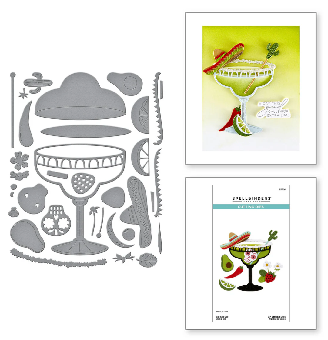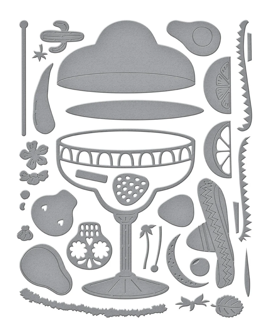 Sip Sip Ole’ Etched Dies are part of the Happier Hour Collection. When assembled, this set of 27 thin metal cutting dies creates festive drinks based on a stemmed wide rim Margarita glass. Details include a line of salt to set on the glass rim and plenty of garnishes to choose from. For extra fun, there are accents to add to set the vibe: sombrero, cactus, sugar skull, strawberry and more!