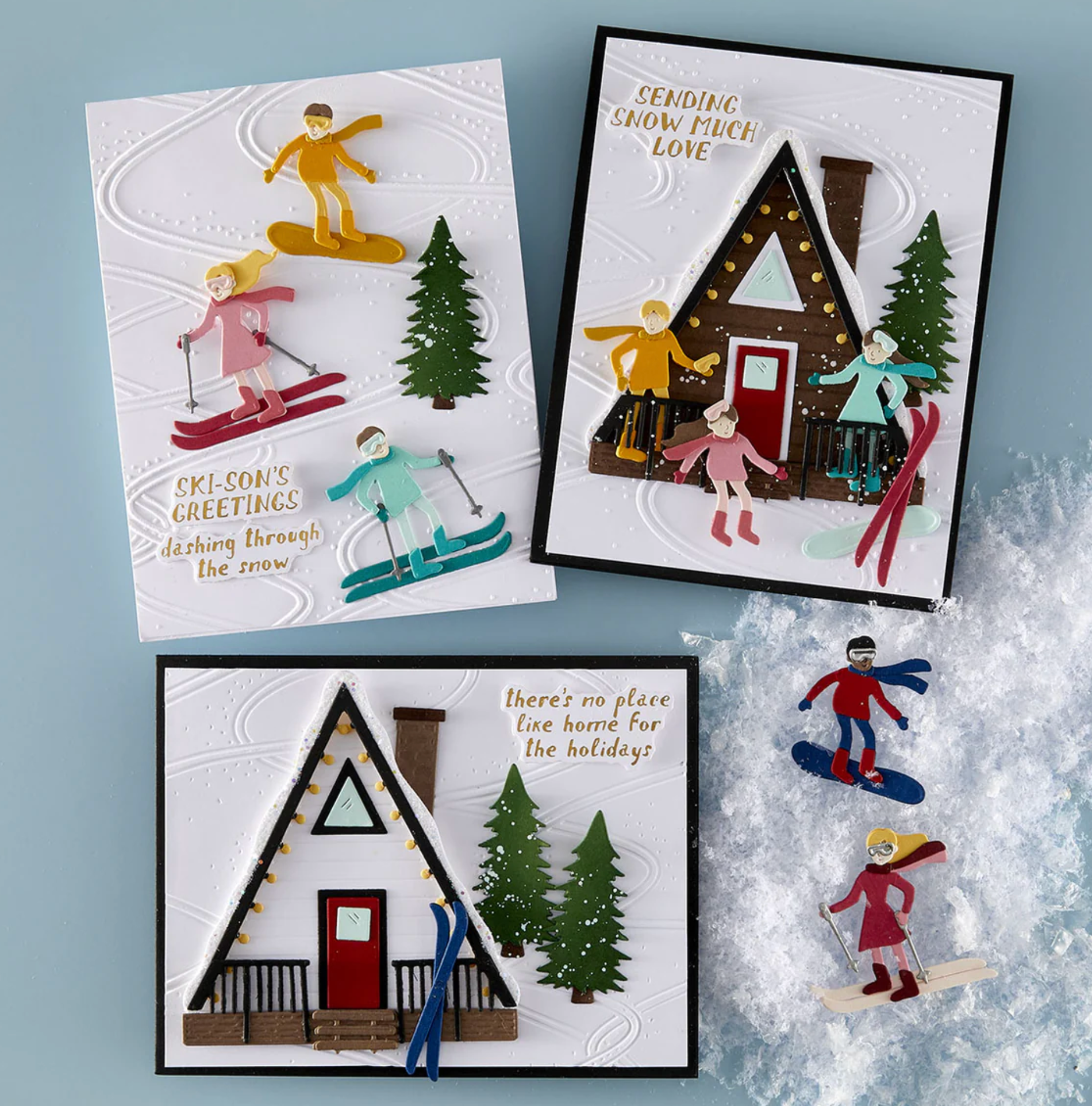 Ski-son's Greetings Dies and 3D Folder Bundle includes Hit the Slopes Dies, Ski Lodge Dies, and Streamline 3D Embossing Folder. Together, these sets create a winter wonderland for skiers, snowboarders and outdoor fans! What a fun ensemble to mark winter memories.