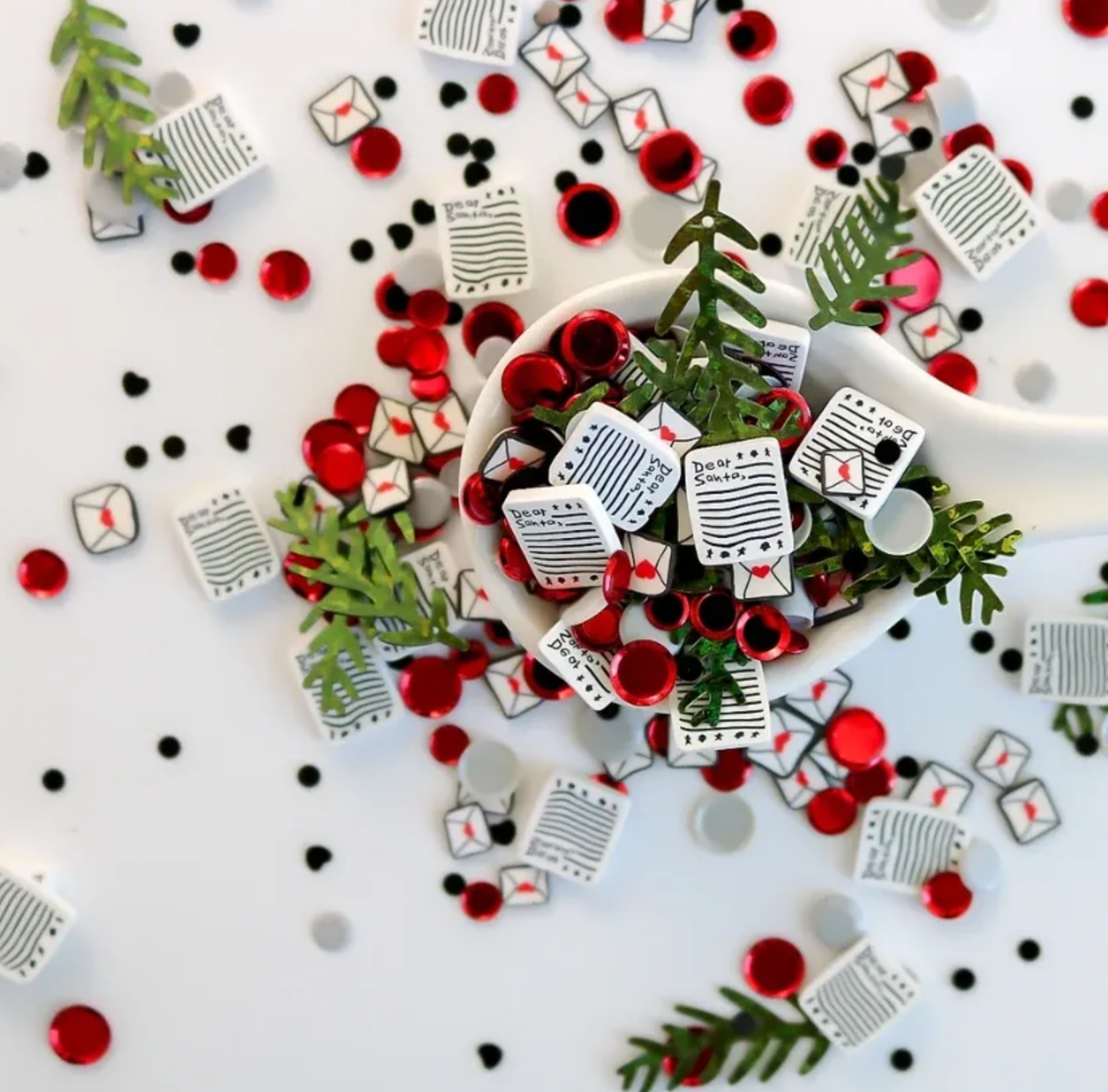 Get in the holiday spirit with our Christmas Post Mix! This unique mix of polymer clays and sequins is the perfect addition to your holiday crafting projects. Pair it with our Christmas Post 6 x 6 Paper Pad for a coordinated look. Each mix includes Dear Santa polymer clays, envelopes sealed with a heart polymer clays, metallic and iridescent sequins, and more. We mix each batch in-house for a unique blend that will make your projects stand out. Each pack comes with a full tablespoon of our Christmas Post Mix.